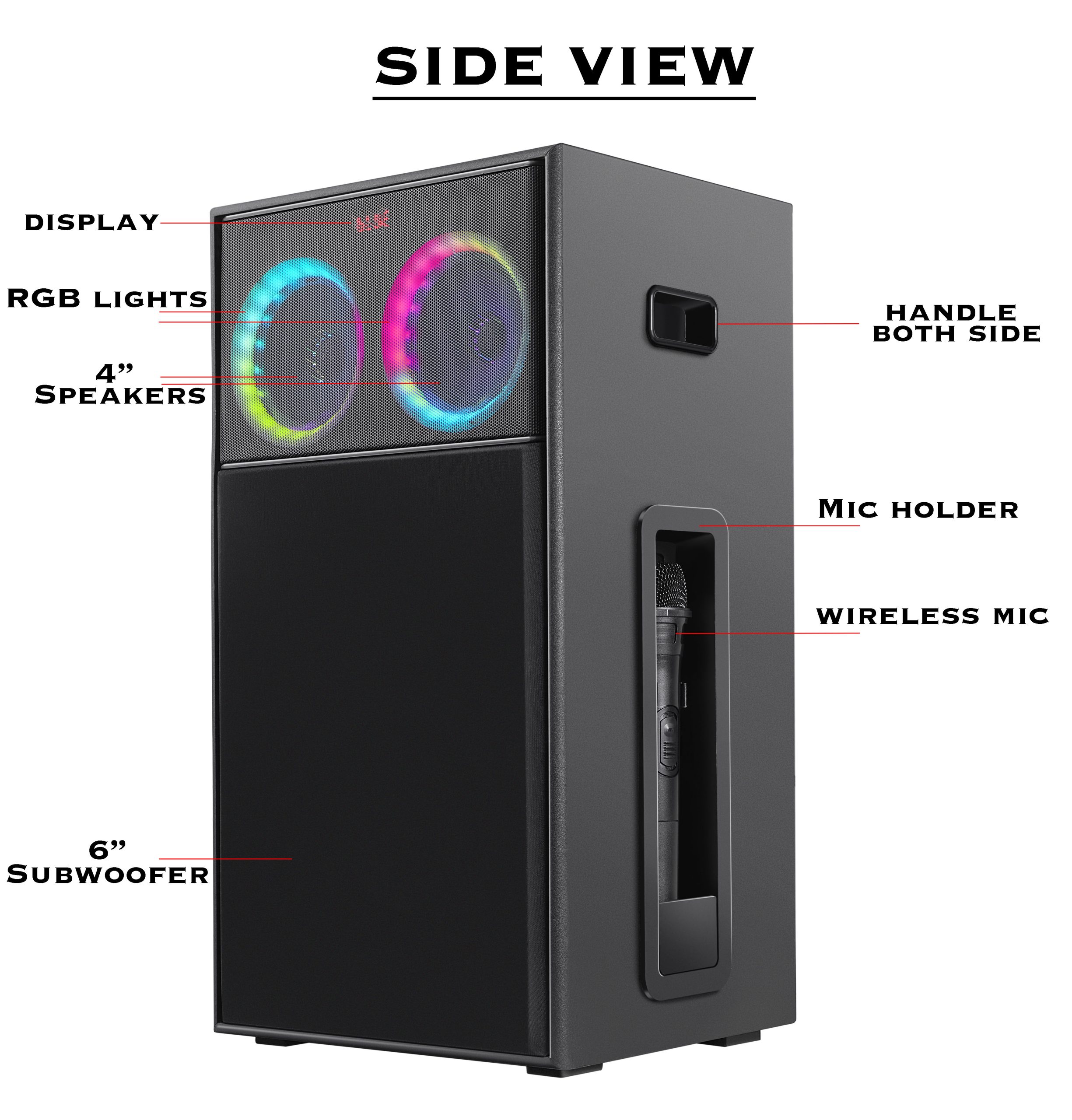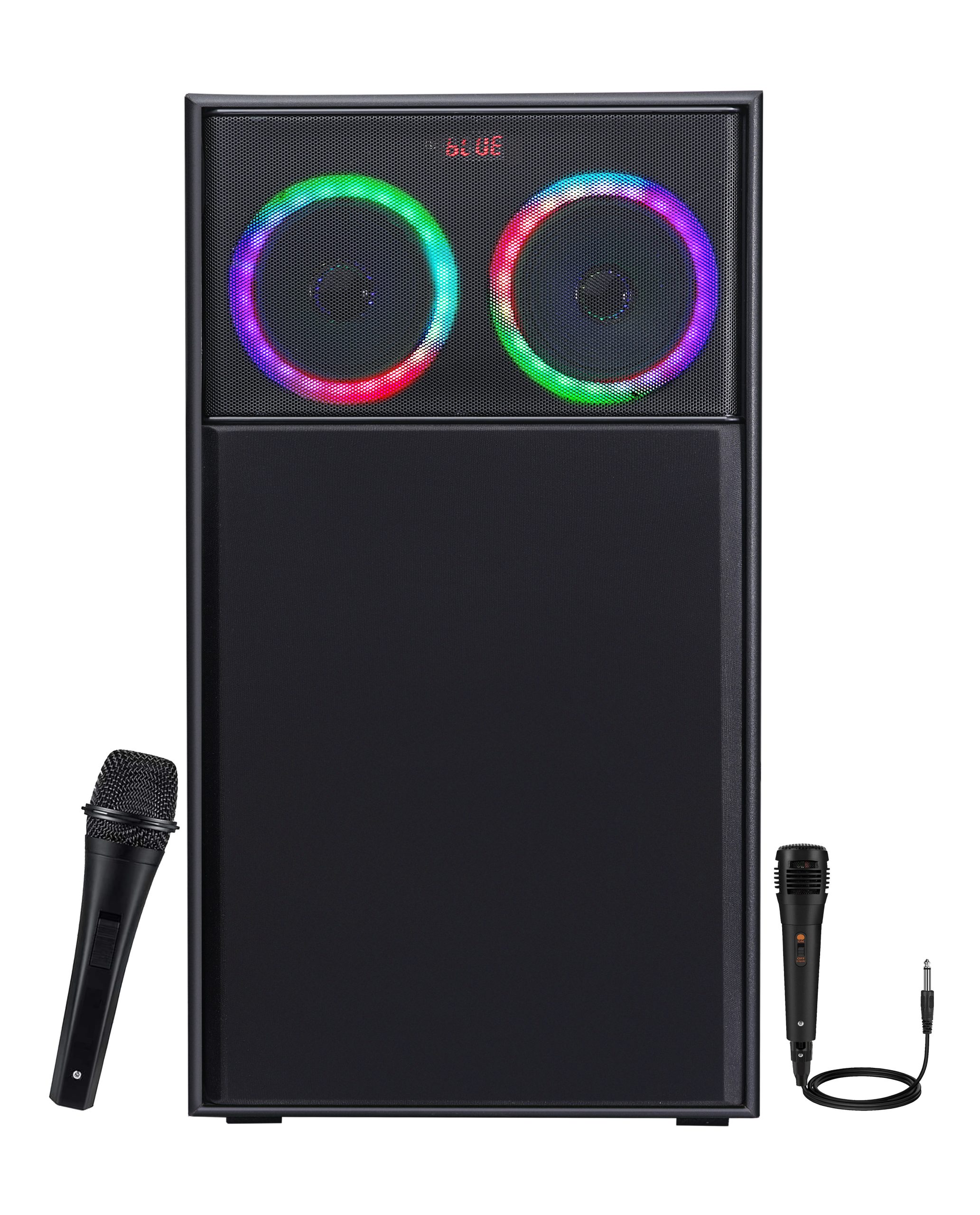 this product comes with 2 mic with excellent bass and sound. i recommend this UIC Speaker.